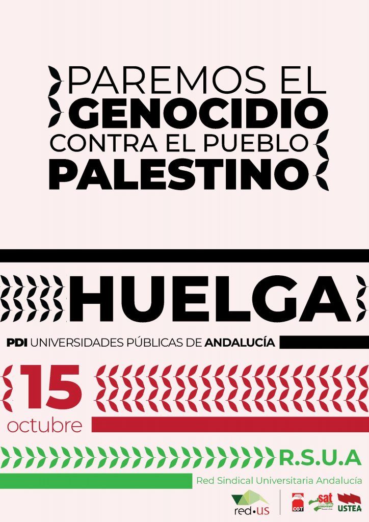 Ante la catástrofe humanitaria que se está viviendo en Gaza, REDUS (Red Intersindical Universitaria de Andalucía) convoca a toda la comunidad universitaria —personal docente, investigador y alumnado— a sumarse a la Jornada de Huelga y movilización el 15 de octubre.